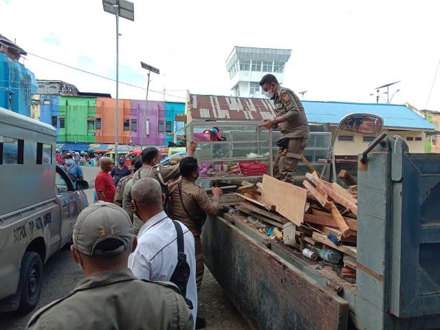 “Hari ini Rabu 2 Juni pukul 14.00 WIT telah dilakukan penertiban dan dibongkar dua lapak, sedangkan satu kios tidak dibongkar karena dibangun oleh Pemkot, namun kios tersebut sementara kita segel,”ujarnya.