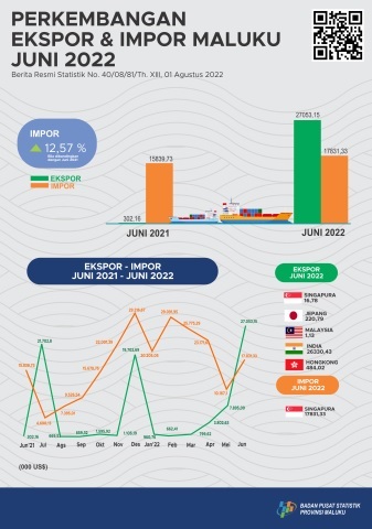 Ekspor Maluku selama bulan Juni 2022 melalui 3 pelabuhan yaitu Pelabuhan Yos Sudarso, Bandara Pattimura dan Pelabuhan Bula. Pada bulan ini tidak ada ekspor melalui Pelabuhan Tual, Dobo, dan Lirang.