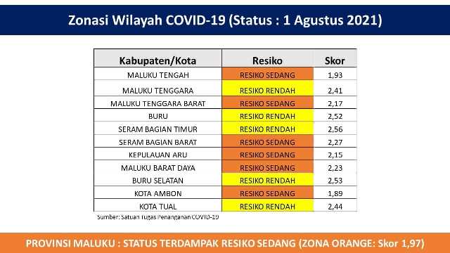 Secara keseluruhan, Provinsi Maluku juga berada pada status terdampak resiko sedang atau zona orange dengan skor 1,97. Kota Ambon sendiri, berada pada skor 1,89 setelah sebelumnya berada pada skor 1,73 yakni di zona merah.