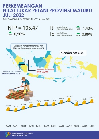 AMBON– Nilai Tukar Petani (NTP) Provinsi Maluku pada Juli 2022 sebesar 105,47 atau meningkat 0,50 persen dibanding Juni 2022 yang tercatat sebesar 104,95.