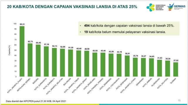 Berikut data lengkap 20 besar kota dan kabupaten yang pelaksanaan vaksinasi lansia diatas 25 persen: