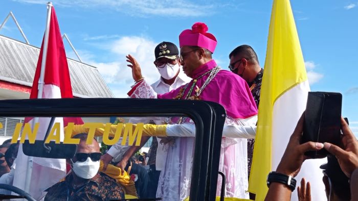 Di bandara, Uskup Seno disambut oleh Bupati Muhammad Thaher Hanubun dan para pejabat lainnya.
