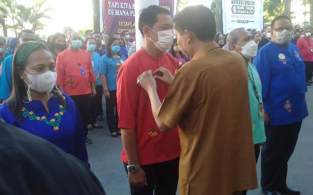 Tekad ini dinyatakan dengan penyematan Pin “Kota Ambon Menuju WTP” oleh Penjabat Wali Kota, Bodewin M. Wattimena secara simbolis kepada sejumlah ASN, saat apel pagi di Halaman Parkir Pemkot Ambon, Selasa (7/6/2022)
