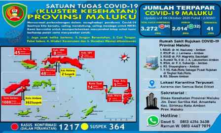 AMBON- Satuan Tugas Penanganan Covid-19 Provinsi Maluku merilis, hari ini, Kamis (8/10/2020) pasien terkonfirmasi Corona Virus Disease 2019 (COVID-19) di Provinsi Maluku sebanyak 94 orang. Dengan demikian, total terkonfirmasi di Maluku sampai saat ini sebanyak 3272.
