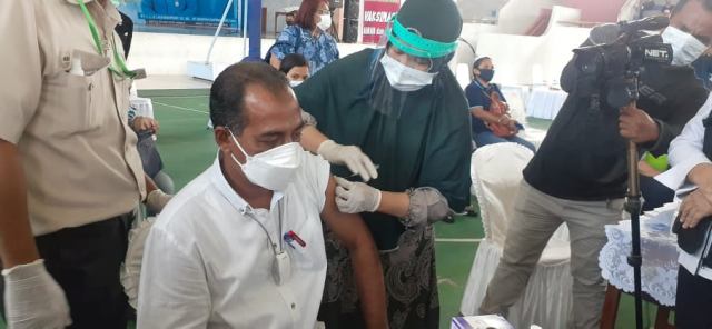 AMBON-Pemerintah Kota (Pemkot) Ambon menggelar vaksinasi secara massal bagi petugas pelayanan publik se-kota Ambon mulai 8-20 Maret 2020 mendatang, dilaksanakan di gedung sporthall, Selasa (9/3/2021).