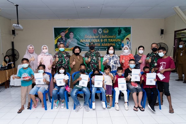 Hari ini Pangdam meninjau pelaksanaan vaksinasi di SD Kartika dengan target sebanyak 200 anak,  dan SD Xaverius sebanyak 1000 anak dengan menggunakan vaksin Sinovac. Jumlah tenaga kesehatan dan tenaga  pendukung yang terlibat kegiatan vaksin anak ini pun mencapai 51 orang, baik dari Kesdam XVI/Pattimura maupun Dinas Kesehatan Kota dan Puskesmas setempat. (EVA)