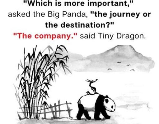 Mana yang lebih penting, apakah perjalanan yang sedang mereka lakukan ataukah tempat tujuan akhir yang mereka akan tuju?, tanya panda kepada naga. Si naga menjawab bijaksana, bukan tujuan akhir atau perjalanan menuju tempat yang baru yang lebih penting, namun kemitraan yang terjalin baik dan nyaman bagi semua pihak selama perjalanan menuju tujuan bersama, itu yang paling penting.