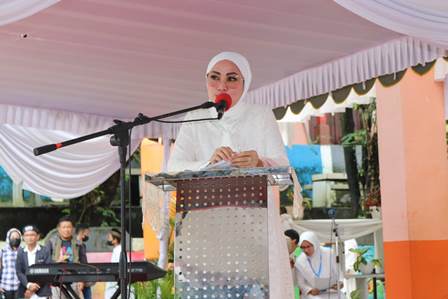 AMBON– Widya Pratiwi Murad Ismail selaku Ina Latu Maluku (mamanya/ibu dari anak-anak Maluku) menghadiri perayaan Idul Adha 1443 Hijiriah yang dirangkaikan dengan penyembelihan, penyerahan daging qurban serta peragaan manasik haji yang digelar SMP Negeri 14 Ambon, Selasa (12/7/2022.