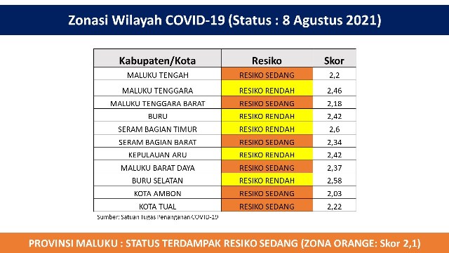 Secara keseluruhan, sesuai data yang diperoleh info-ambon.com, grup Siberindo, Kamis (12/8/2021) Provinsi Maluku juga berada pada status terdampak resiko sedang atau zona orange dengan skor 2,1. Skor ini lebih baik disbanding pecan sebelumnya yang hanya pada skor 1,97.