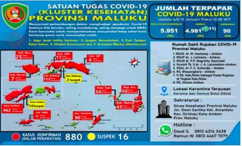 Dalam rilis harian yang diperoleh info-ambon.com, Rabu (13/1/2021) pagi ini, dengan tidak adanya pertambahan kasus konfirmasi baru tersebut, maka total konfirmasi di Maluku sebanyak 5951 orang.