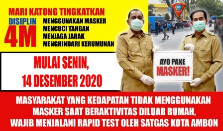 “Besok Senin (14/12/2020) masyarakat yang kedapatan tidak menggunakan masker saat beraktivitas diluar rumah wajib menjalani rapid tes oleh Satgas Kota Ambon, dan jika reaktif maka dilanjutkan dengan swab tes,” kata Juru Bicara Covid-19 kota Ambon, Joy Adriaansz, Minggu (13/12/2020).