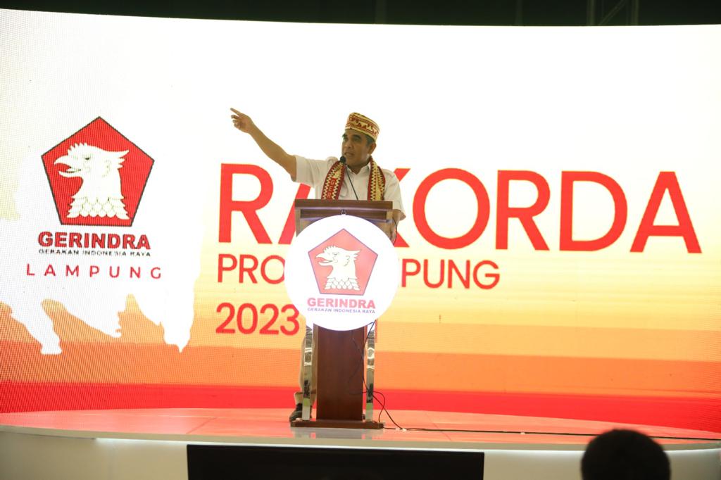 LAMPUNG— Sekretaris Jenderal Partai Gerindra Ahmad Muzani menghadiri Rapat Koordinasi Daerah (Rakorda) DPD Gerindra Lampung, Rabu (14/6). Pada kesempatan ini Muzani meminta para kader Gerindra di Lampung untuk terus bekerja keras demi memenangkan Prabowo Subianto sebagai presiden pada Pilpres 2024.