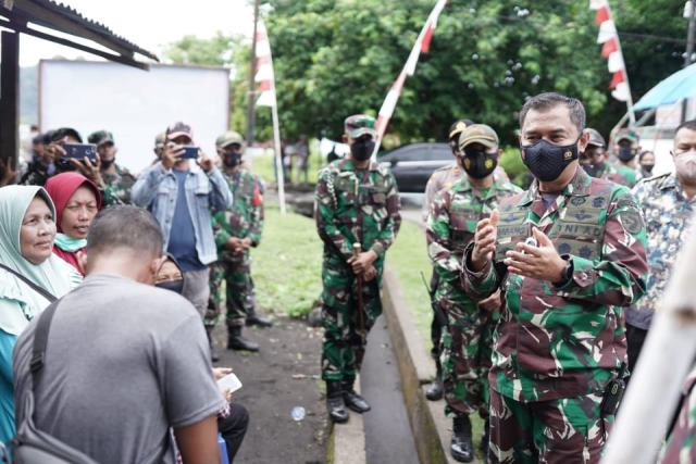 AMBON-Pangdam XVI/ Pattimura, Mayjen TNI Bambang Ismawan, yang didampingi oleh Ketua Persit KCK PD XVI/ Pattimura, Ny. Shinta Bambang Ismawan, beserta rombongan meninjau secara langsung pelaksanaan serbuan vaksin di Puskesmas Banda, Minggu (14/11/2021).