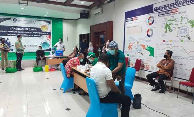 Ambon – Sebanyak 105 pegawai dan pensiunan Bank Indoensia serta pihak ketiga menjalani vaksinasi di kantor tersebut, Selasa (16/3).