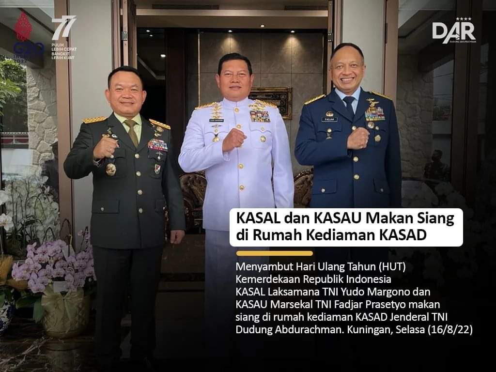 Di sela-sela kegiatan di gedung parlemen, KSAD, KSAL, dan KSAU bercengkerama menghabiskan waktu bersama di kediaman Jenderal Dudung di kompleks Pati, Kuningan, Jakarta, Selasa (16/8/2022).