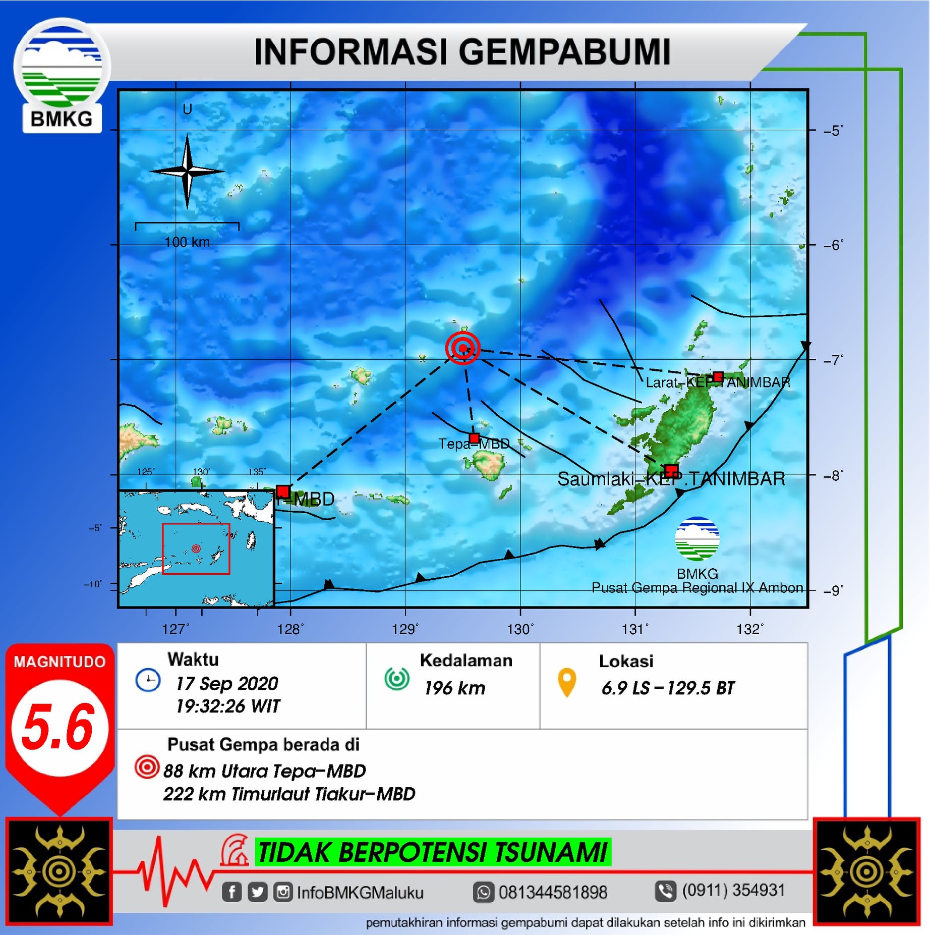 Sementara informasi gempa kedua dilaporkan berkekuatan magnitude :5.6 SR, yang terjadi sekitar pukul 19:32:26 WIT, dengan lokasi :6.9 LS-129.5 BT (88 km Utara Tepa-MBD, 222 km Timurlaut Tiakur-MBD), Kedalaman:196 km.