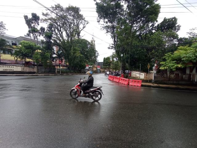 AMBON-Akhirnya Dinas Perhubungan (Dishub) Kota Ambon bersama pihak Satlantas Polda Maluku membuka blokade water barrier yang melintang di persimpangan jalan Rijali dan jalan Pattimura depan Polda Maluku.