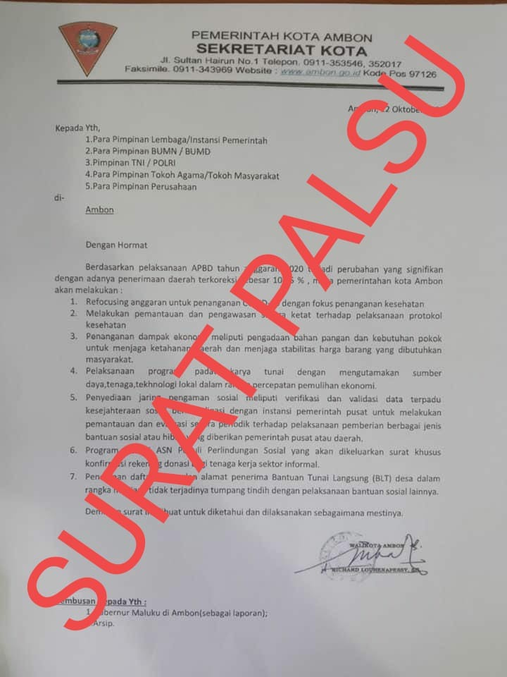 ‘’Jadi surat ini sama sekali tidak pernah dibuat Pemkot Ambon. Surat itu hoax,’’ tegas Adriaansz.