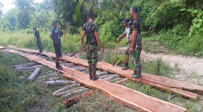 Selain pengalian drainase, personil juga melakukan perbaikan jalan, pendistribusian material pembangunan jembatan penghubung kawasan perkampungan rakyat dengan Kampung Belakang Wamar yang dipimpin langsung oleh Danramil 1503-04/Jerol Kapten Inf Dody Masaoy.