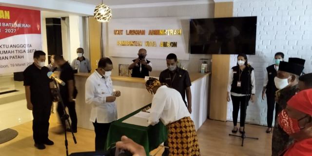 Ambon -Walikota Ambon Richard Louhenapessy resmi melantik anggota saniri Batumerah masa bakti 2021-2027, Pengganti Antar Waktu (PAW) anggota saniri negeri Halong dan Rumah Tiga, serta PAW Badan Pemusyaratan Desa (BPD) Hunut Durian Patah (Hundap) di Unit Layanan Administrasi (ULA) Balai Kota Ambon, Jumat (19/3/2021).
