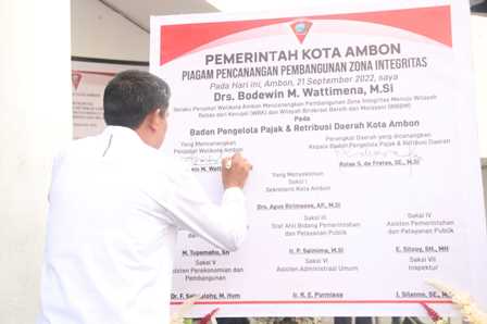 Ambon -Guna meningkatkan kualitas pelayanan publik, Pemerintah Kota (Pemkot) Ambon mencanangkan Zona Integritas menuju Wilayah Bersih dari Korupsi (WBK) dan Wilayah Birokrasi Bersih dan Melayani (WBBM) di dua Organisasi Perangkat Daerah (OPD), yakni, Penanaman Modal dan Pelayanan Terpadu Satu Pintu (DPMPTSP) dan Badan Pengelola Pajak dan Retribusi Daerah (BPPRD).