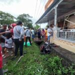 Tabrakan terjadi diduga cukup keras sehingga menyebabkan mobil masuk ke dalam teras sebuah bangunan ruko sementara sepeda motor ringsek dan masuk dalam got muka bangunan tersebut.