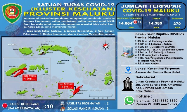 Dengan penambahan kasus di Kota Ambon, maka saat ini, dari 11 kabupaten/kota di Maluku, tercatat sudah 2 kabupaten/kota yang ada kasus terkonfirmasi, yakni Kota Ambon dan Kabupaten Kepulaulan Tanimbar(PJ-info-ambon)