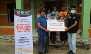 Lembaga kemanusiaan Aksi Cepat Tanggap (ACT) cabang Maluku bersama Masjid Nurussyifa RST Ambon berbagi beras gratis untuk anak santri dan yatim piatu di Ambon. Aksi peduli sesama itu digelar di dua pondok pesantren pada Sabtu, 22 Januari 2022.