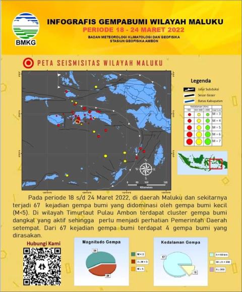 “Per 18 sampai 24 Maret 2022 terjadi 67 kejadian gempa bumi, yang didominasi gempa bumi kecil (m<5), kata Kepala BMKG stasiun Geofisika Ambon, Herlambang Hudha dalam rilis tertulisnya yang diterima info-ambon.com, grup Siberindo.co, Jumat (25/3/2022).
