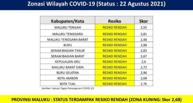 Dari daftar zonasi wilayah Covid-19 yang dikeluarkan Satuan Tugas Penanganan Covid-19 tertanggal 22 Agustus 2021, untuk seluruh wilayah di Maluku, semuuanya berada di resiko rendah atau zona kuning.