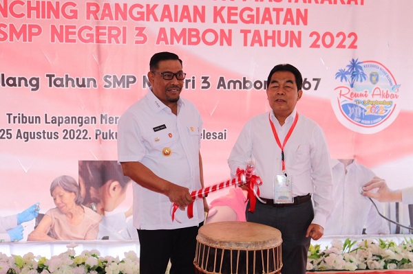 Gubernur Maluku Murad Ismail sebagai salah satu alumni angkatan ke-76, hadir melaunching pelayanan kesehatan dimaksud, yang ditandai pemukulan tifa.