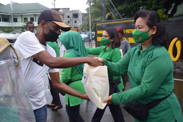 AMBON-Indahnya berbagi di bulan suci ramadhan 1443 H, pengurus Persit Kartika Chandra Kirana (KCK) Koorcab Rem 151 PD XVI/Pattimura menggelar kegiatan sosial membagikan paket sembako kepada tukang becak yang melintas di depan Makorem 151/Binaiya, Jl. A. Yani No. 1 Kota Ambon, Senin (25/04/2022).
