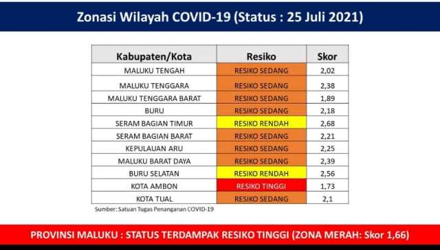 Dari daftar zonasi wilayah Covid-19 yang dikeluarkan Kementrian Kesehatan tertanggal 25 Juli 2021, yang didapat info-ambon.com, grup siberindo.co untuk wilayah lainnya di Maluku, ada 8 daerah yang berada di resiko sedang atau zona orange, dan 2 wilayah lainnya yakni Seram Bagian Timur (SBT) dan Buru Selatan (Bursel) yang berada pada zona kuning atau resiko rendah.