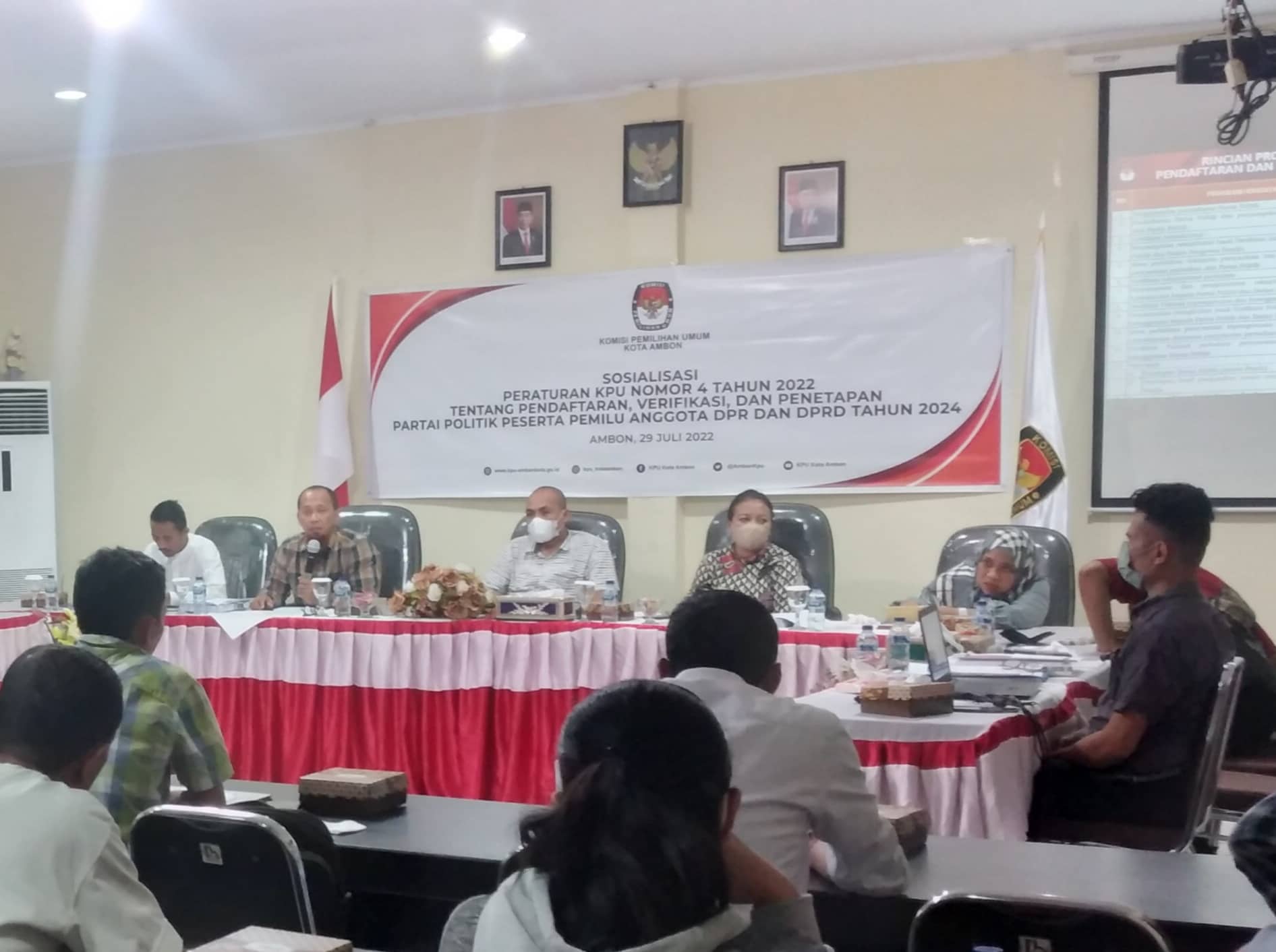 AMBON-Komisi Pemilihan Umum (KPU) Kota Ambon menggelar sosialisasi Peraturan Komisi Pemilihan Umum (PKPU) no 4 tahun 2022 tentang pendaftaran, verifikasi, dan penetapan Partai Politik (Parpol) peserta Pemilu anggota DPR dan DPRD tahun 2024 mendatang. Sosialisasi yang dilaksanakan di Lantai II Kantor KPU Kota Ambon, Jumat (29/07/2022).