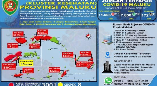 AMBON-Hari ini, Provinsi Maluku menambah 345 kasus konfirmasi baru. Dengan demikian, jumlah kasus positif Covid-19 di Maluku sudah sebanyak 11.003 orang. Data