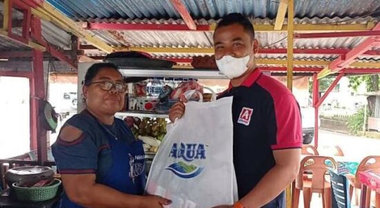 AMBON-AQUA mengandeng Alfamidi kompak bagikan protection package untuk para pedagang kecil di masa pandemi Covid-19 di Kota Ambon, Jumat (24/12/2021). Adapun lokasi