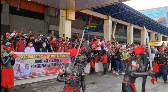 AMBON– Tarian cakalele menyambut kedatangan puluhan atlet, pelatih, teknisi, unsur Chief de Mission (CDM) maupun personel pengamanan yang tergabung Kelompok Terbang (kloter)