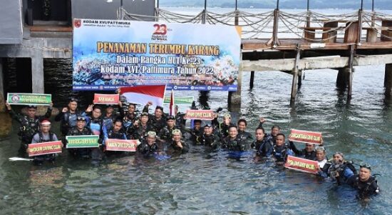 AMBON– Pangdam XVI/Pattimura Mayjen TNI Richard Tampubolon menggagas kegiatan yang bertajuk Kalesang Negeri yaitu penanaman terumbu karang di area laut sekitar kawasan
