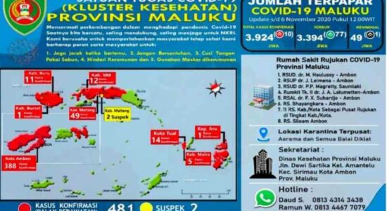 AMBON- Satuan Tugas Penanganan Covid-19 Provinsi Maluku merilis, data kasus di Maluku tertanggal 6 November 2020, sampai pukul 19:00 WIT yakni adanya