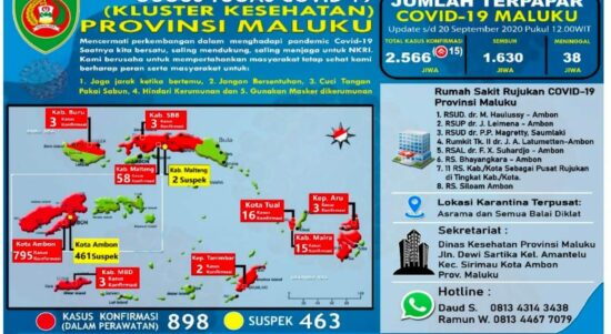 AMBON– Penambahan kasus terkonfirmasi di Maluku, Minggu (20/9/2020) bertambah 15 orang. Demikian siaran pers yang disiarkan Gugus Tugas Percepatan Penanganan Covid-19 Provinsi