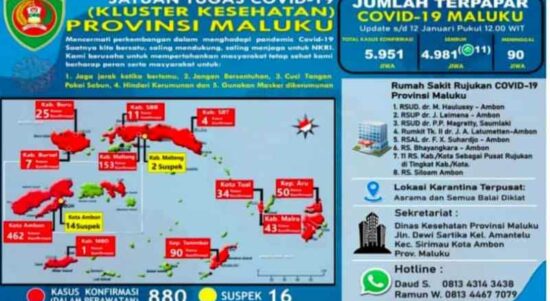 AMBON-Satuan Tugas Penanganan Corona Virus Disease 2019 (Covid-19) Provinsi Maluku, merilis, Selasa 12 Januari 2021, sampai dengan pukul 19:00 WIT, tidak ada