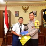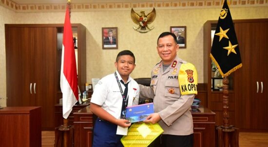 AMBON- Kepala Kepolisian Daerah Maluku, Lotharia Latif memberikan apresiasi kepada Gennaro Alexandro Suitela, siswa SMP Katolik Ambon, peraih juara 2 Lomba Menulis
