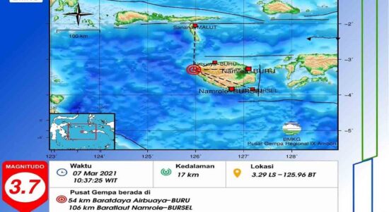 Ambon – Gempa bumi tektonik berkekuatan magnitudo M 3,7 terjadi di wilayah Pulau Buru, Provinsi Maluku, Minggu (7/3/2021) pukul 10.37 WIT. Informasi yang